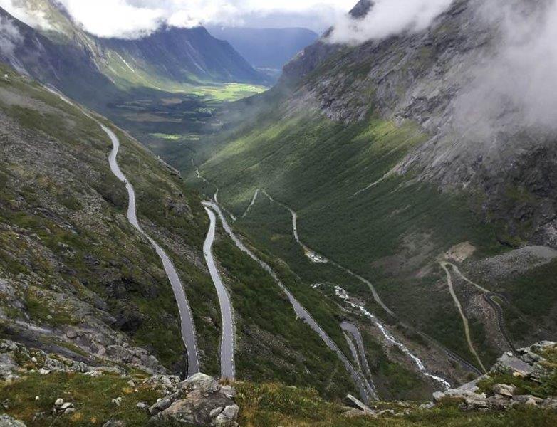 The train departed just after 12md and traveled along the spectacular 71 mile long Rauma railway line. Lovely colored houses dotted the way as we wound our way down into the valleys with high cliffs on either side. At Andalsnes we rejoined the coach, climbing up the high mountain on a very narrow road, negotiating 11 hairpin bends