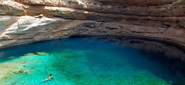 Outside Muscat we crossed the Hajjar Mountain Range, through one of the most majestic canyons – Wadi Bani Awf. The ever-changing landscape was breathtaking. We saw several Wadis during our visit, The Wadi Tiwi is perhaps the most picturesque, with ancient walls around well established gardens and homes. I was in awe of the variety of fruit trees growing in the gardens – papaya, bananas, guavas, oranges, lemons and mangoes interspersed with date palms. Not far from the Wadi is the Bimmah Sinkhole, a spectacular limestone crater with clear blue green water, beautiful to swim in. The journey took us through some of the most amazing land-forms, so dramatic and spectacular that they rival the Grand Canyon.