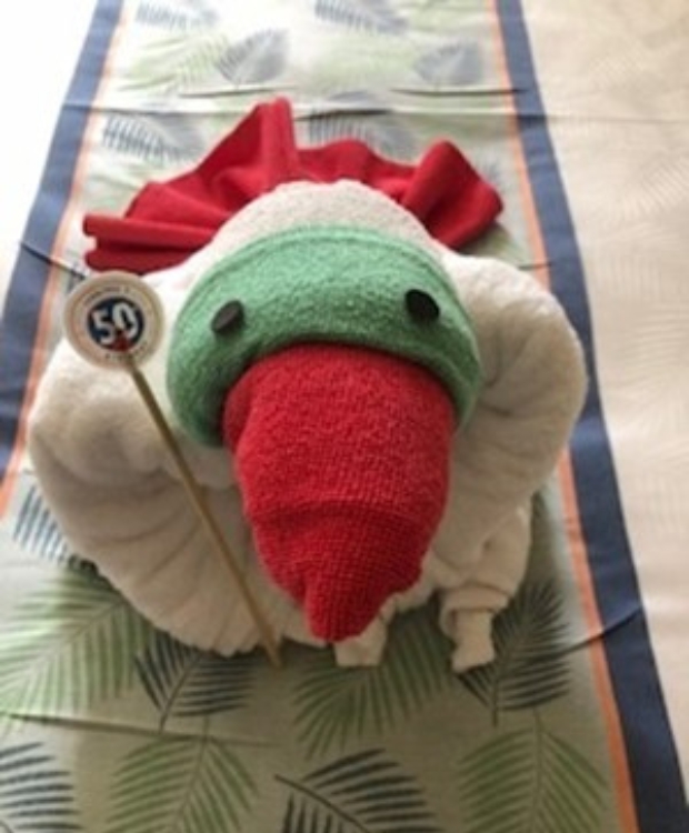 My stateroom was an ocean view cabin. It was very spacious and comfortable fitted with a king bed, coffee table and a lounge with plenty of storage. The best part was to see the towel animals on my bed every day – so fun!