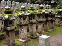 Koya-san is one of Japans most sacred sites located on a mountain-top outside of Osaka. It is the headquarters of Shingon Buddhism, a faith with a wide following throughout Japan. This Buddhist statuary welcomes visitors to this serene and hallowed place. Surrounded by a thick forest of massive cedars it is also the setting for a vast cemetery.