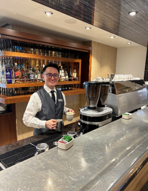 Dustin, Viking Orion’s star barista, and the view form the Explorer Lounge