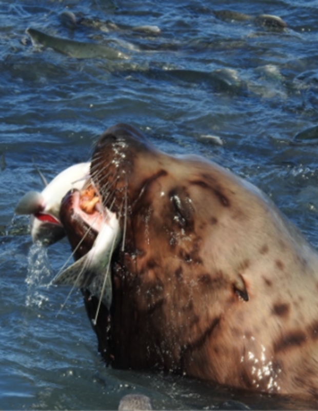 The salmon run is eagerly awaited by the wildlife. Sea-lion image Helen Hayes
